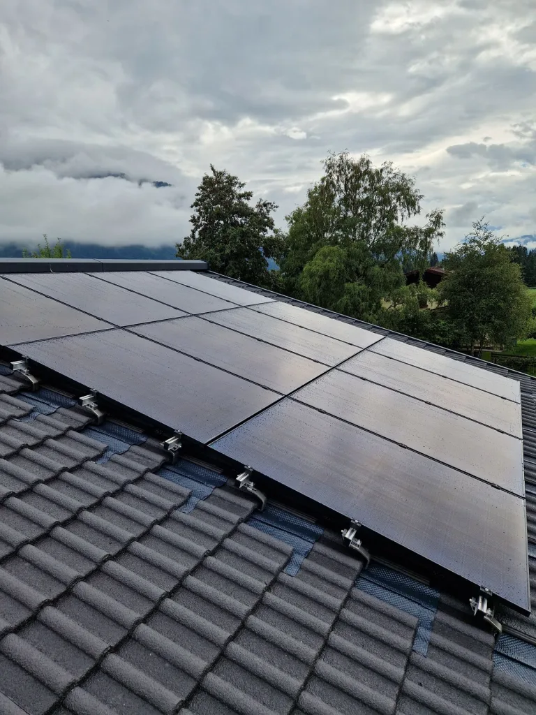 Ein kombiniertes Dach- und Balkon-Photovoltaiksystem mit integriertem Batteriespeicher versorgt das Gebäude nahezu vollständig mit selbst erzeugtem Strom – und fügt sich dabei harmonisch in das alpine Wohnhausdesign ein.